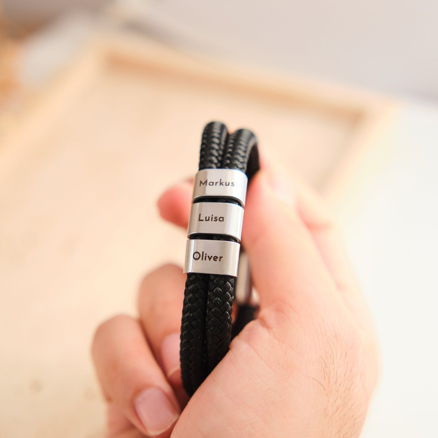 Dieses stilvolle Armband kombiniert ein robustes, doppelt gelegtes schwarzes Tau mit hochwertigen 316L Edelstahl-Elementen in Silber. Jeder Ring kann individuell mit einem Namen, Datum oder kurzem Wort graviert werden – perfekt für Väter, Familie, Partner oder besondere Erinnerungen.