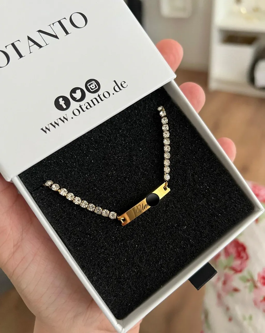 Dieses elegante Armband kombiniert eine schlichte Gravurplatte mit einer funkelnden Gliederkette. Gefertigt aus hochwertigem 316L Edelstahl bleibt es farbbeständig, wasserfest und langlebig. Die goldene IP-Beschichtung sorgt für einen warmen Glanz, der sich perfekt mit jedem Outfit kombinieren lässt.