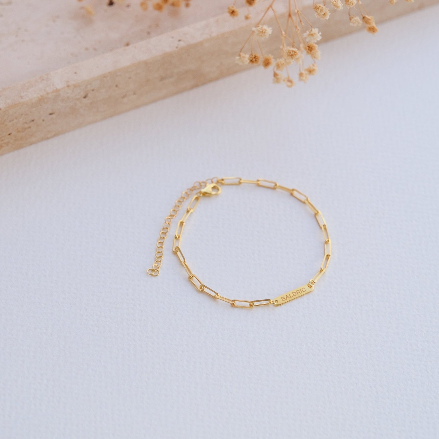 Die zarte Gliederkette mit rechteckigen Kettengliedern wirkt elegant und modern zugleich. In der Mitte befindet sich eine feine Gravurplatte, die individuell mit einem Namen, Datum oder einem kurzen Wort personalisiert werden kann – perfekt als persönliches Geschenk für einen besonderen Menschen oder als stilvolles Schmuckstück für dich selbst.