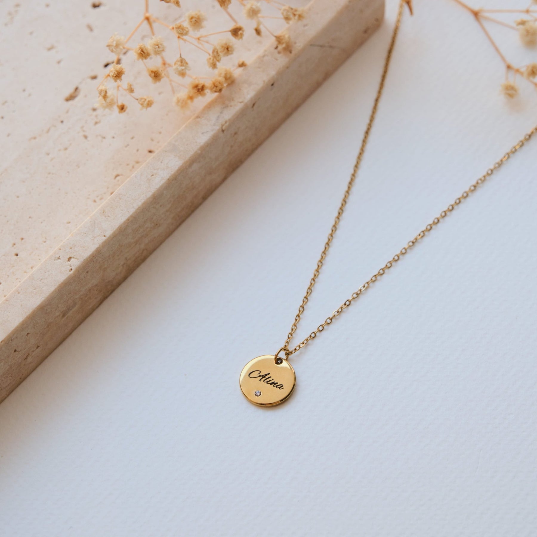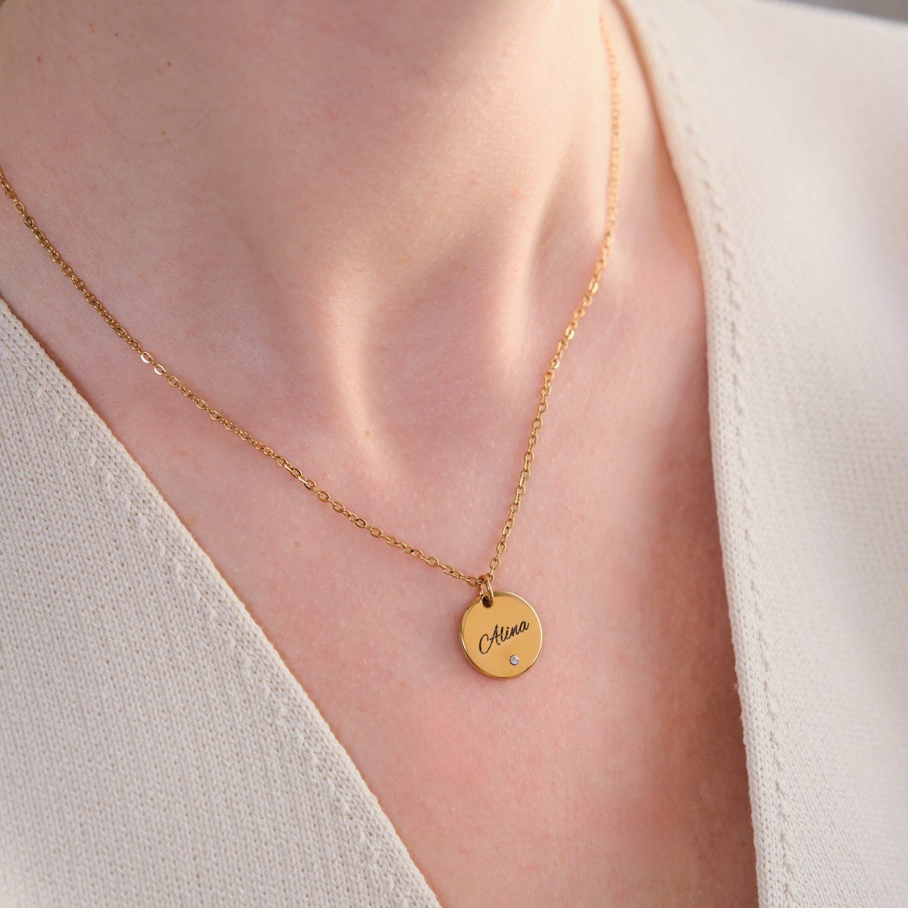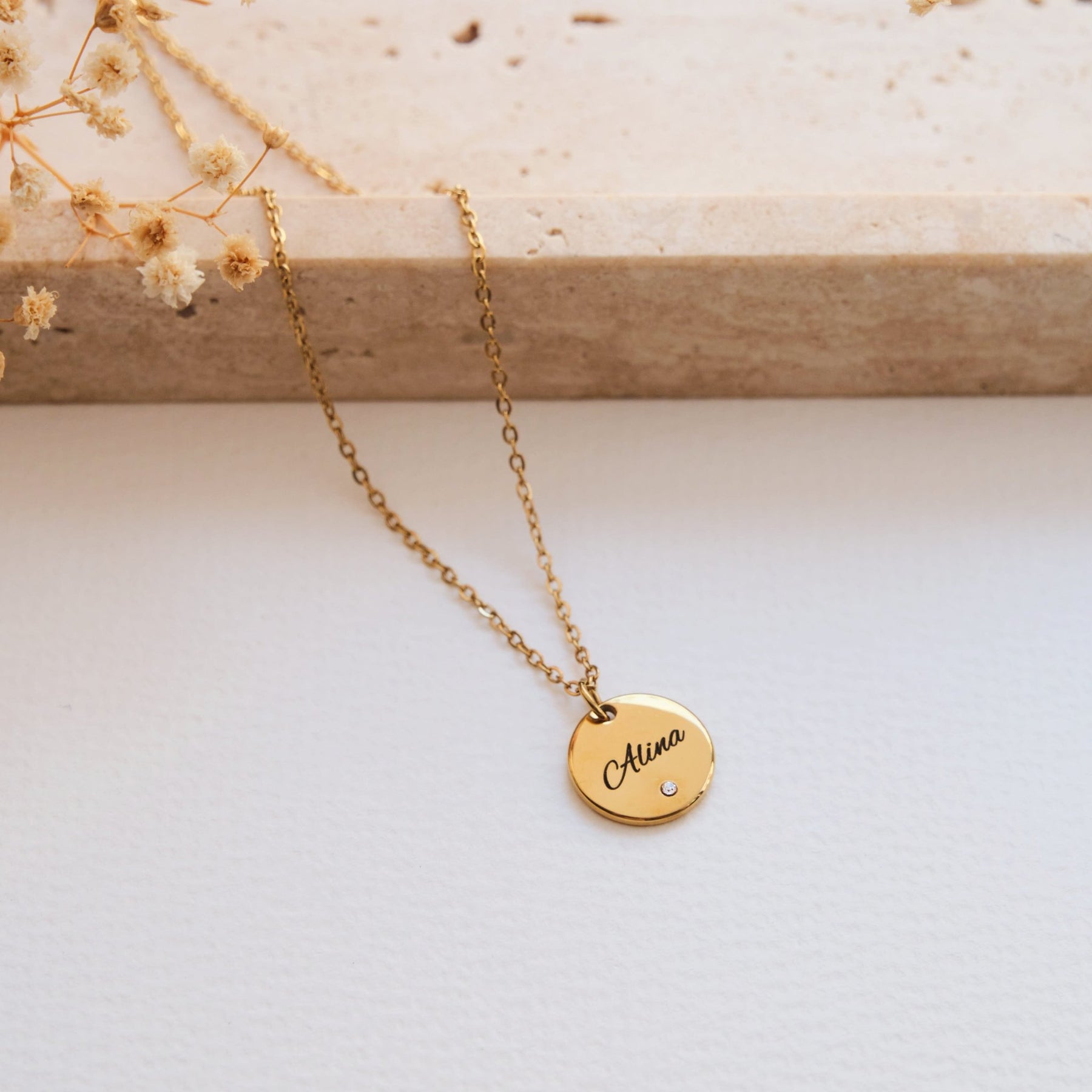 Diese stilvolle Halskette mit rundem Anhänger und funkelndem Zirkonia wird durch deine persönliche Gravur zu einem einzigartigen Schmuckstück. Der Name, den du eingravieren lässt, verleiht der Kette eine ganz besondere Bedeutung – ideal als Geschenk oder zum Selbsttragen.
