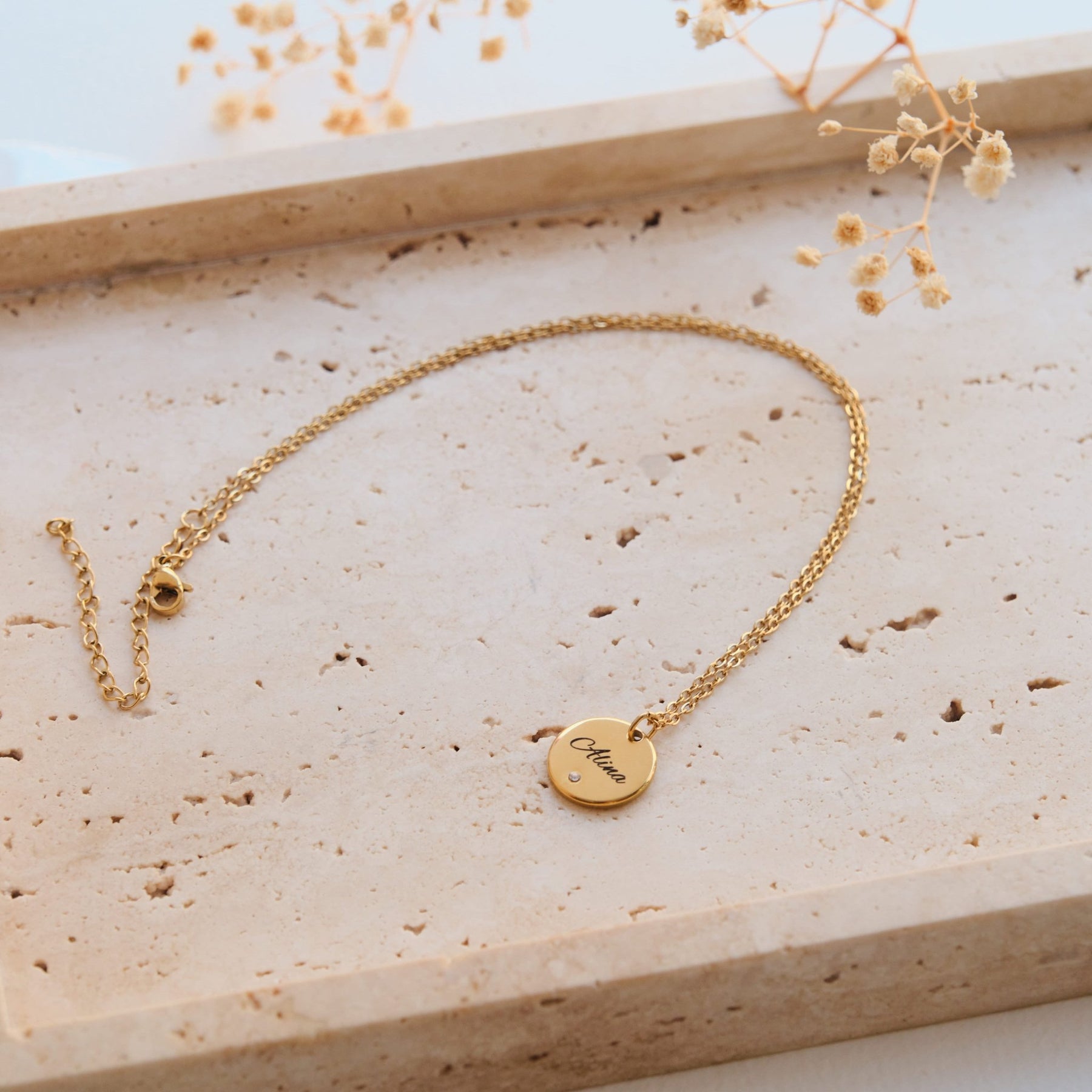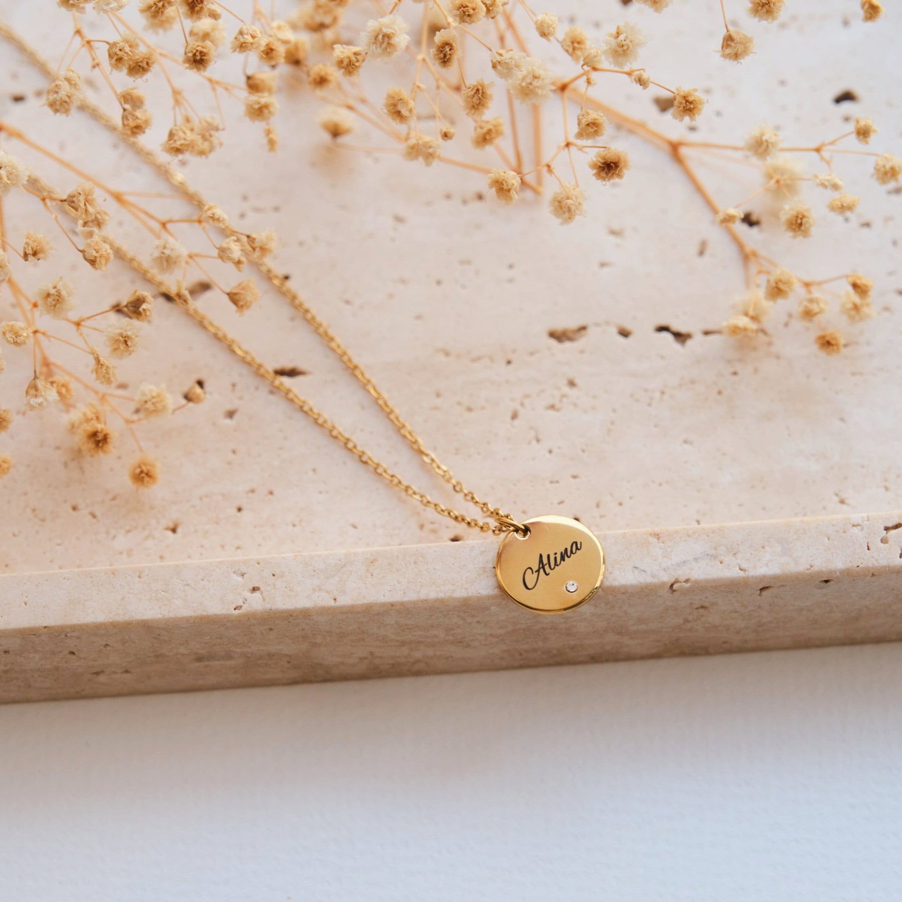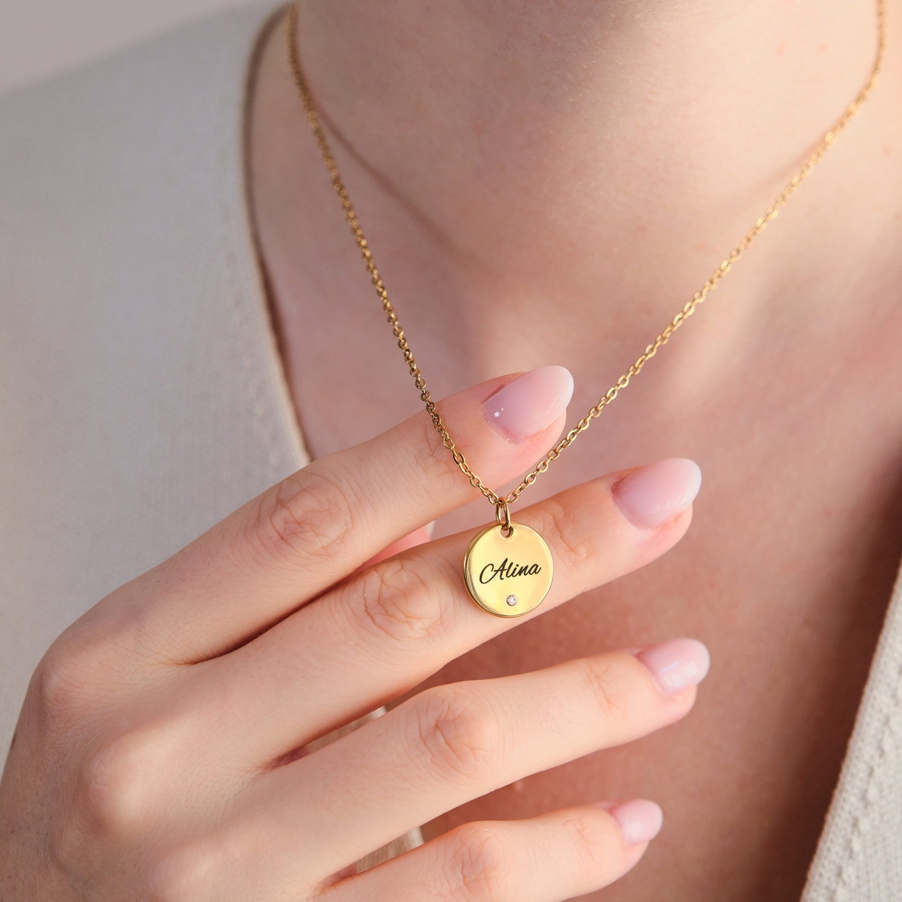 Diese stilvolle Halskette mit rundem Anhänger und funkelndem Zirkonia wird durch deine persönliche Gravur zu einem einzigartigen Schmuckstück. Der Name, den du eingravieren lässt, verleiht der Kette eine ganz besondere Bedeutung – ideal als Geschenk oder zum Selbsttragen.